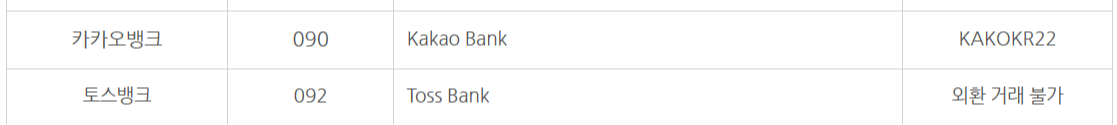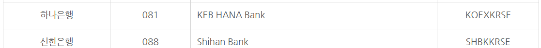 예를 들면, KB국민은행의 영문명과 SWIFT CODE는 다음과 같습니다.