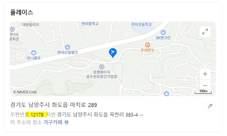 위와 같이 주소를 넣으면 화면 오른쪽에 우편번호가 나타납니다.