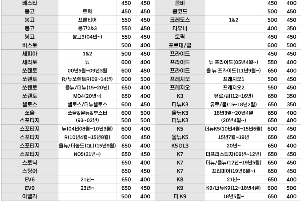 - K3 (유로/쿱 12~16년): 운전석 650 / 조수석 350