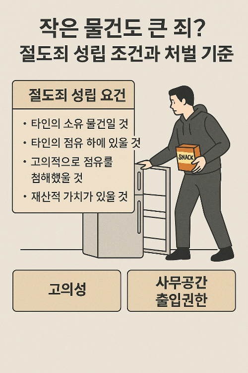 이 사건은 단순히 “간식 하나로 벌금 5만원이라니 너무 과하다”는 시선으로만 볼 일은 아닙니다. 형법상 절도죄가 성립하려면 어떤 요건이 필요한지, 그리고 회사 공간에서의 ‘암묵적인 동의’가 법적 효력을 가지는지에 대해 중요한 기준을 제시한 판례입니다.