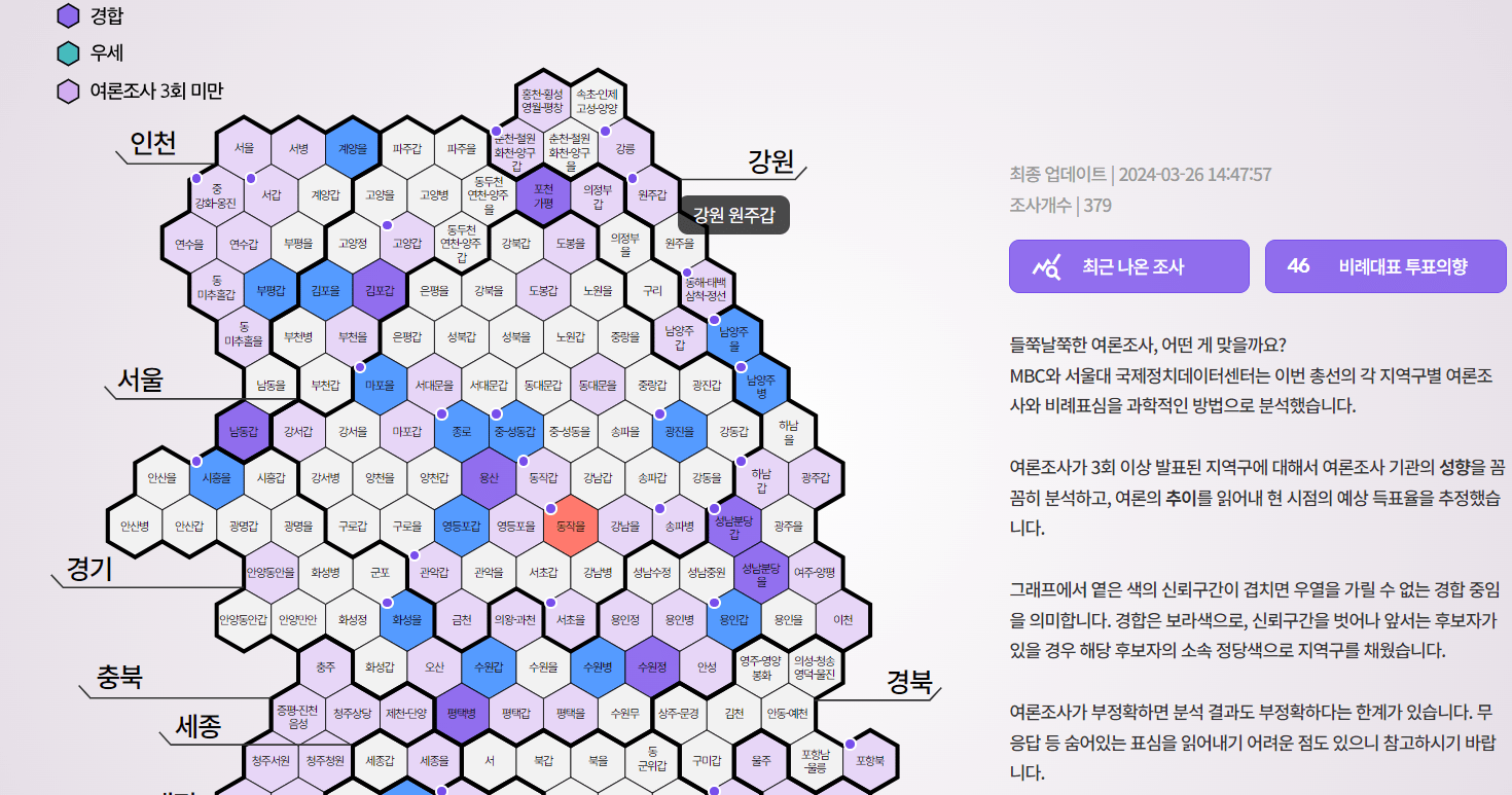 벌집처럼 표현된 지도와 색깔로 여론조사 선호도를 확인할 수 있습니다. 또, 블록으로 표시된 지역을 클릭하면 상세 내용도 확인이 가능해요.